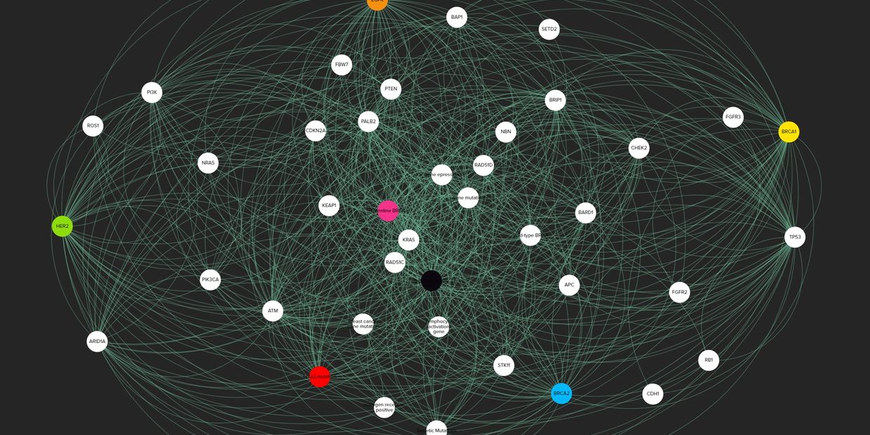 We also lead discovery and assessment programs across genes, biomarkers, and other areas to assess and illustrate key relationships. This model shows the relationship between the top 30 genes most often mutated in breast cancer AND BRCA1 based on analysis of >200,000 publications.